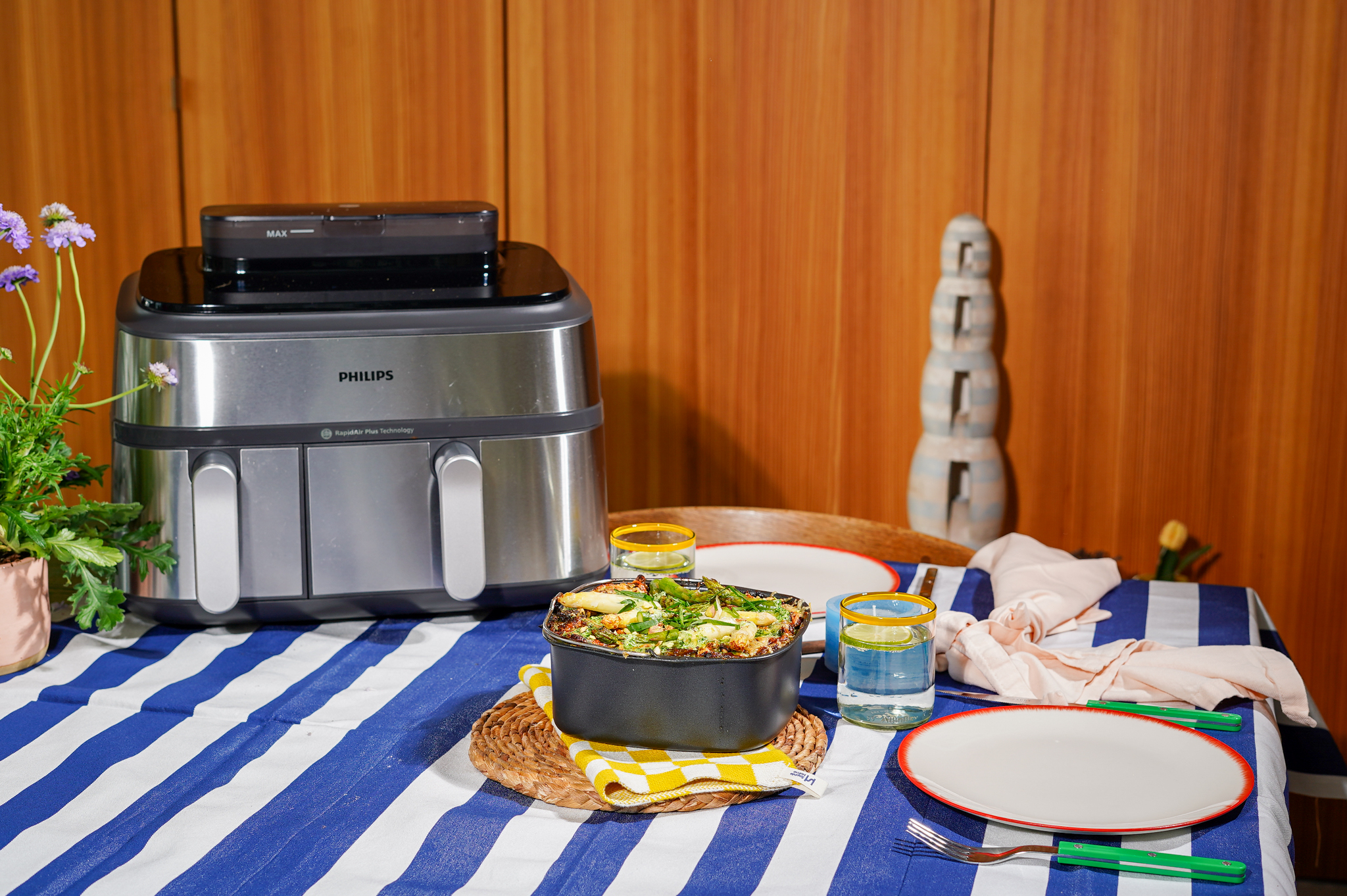 Met de Philips Airfryer met dubbele mand en geïntegreerde stoomfunctie krijgen deelnemers een extra dimensie in handen. Ze kunnen gelijktijdig verschillende bereidingen uitvoeren én spelen met contrasten in textuur: krokant vanbuiten, sappig vanbinnen. Dat opent de deur naar verrassende gerechten, zowel in de studio als thuis.