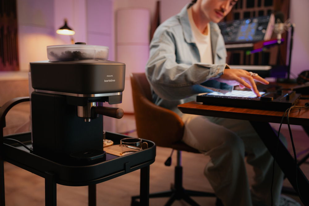 “Voor mij draait alles om sfeer, of ik nu een track produceer of koffie zet. Met de Baristina met Bean swap kan ik mijn koffie aanpassen aan mijn mood: iets krachtigs en energiek tijdens een studiosessie, of juist een zachte blend voor een late avond. Eén machine, eindeloos veel vibes,” vertelt Henri.